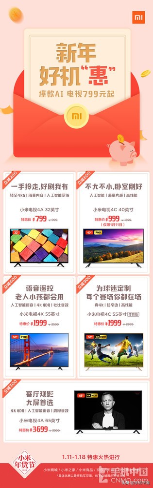 【CNMO新闻报道】新春佳节邻近,大伙儿的情绪想来早已飞翔了吧!而新年疯狂购物是大家的传统式。2020年用什么别着急,1月21日也就是今日,“小米年货节”宣布打开,今日24小时,小米电视机5C 40英寸疯抢24小时,仅999元就可以把智能电视机带回去,小米电视机5C 55英寸、小米电视机4C 55英寸超低价仅1999元。
